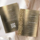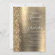 The left-hand edge of this elegant modern wedding invitation features a gold faux glitter border. The customizable text combines white handwriting, copperplate and italic fonts on a gold faux brushed metal background. The reverse side provides space for wedding details on a gold brushed metal background, along with a QR code guests can scan to visit your website and RSVP, which saves the cost of printing and mailing separate RSVP cards.
