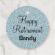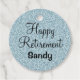 Personalisiert Glam Happy Retirement favorisiert Tags mit einem hellblauen silbernen Glitzer Glitzern Hintergrund und elegantem schwarzen Schrift. Sie können einfach den Namen Ihrer Wahl hinzufügen und die Farbe und den Schriftart des Namens ändern, indem Sie die Option anpassen!