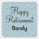 Personalisierter Glam Happy Retirement Quadrat Aufkleber mit einem hellblauen silbernen Glitzer Glitzern Hintergrund und elegante schwarze Schrift. Sie können einfach den Namen Ihrer Wahl hinzufügen und die Farbe und den Schriftart des Namens ändern, indem Sie die Option anpassen!