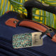 Blau-schwarze Leoparden auf einer glänzenden goldenen Kulisse mit goldgelbem Perlenhalskettenrand, wo oben eine goldglänzende Kante steht, an der man sie mit einem Namen, einer Phrase oder einem Logo personalisieren kann, oder man behalte sie wie mit den Worten "Boss Lady". Chic Glam Leopard Thema.