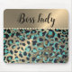 Blau-schwarze Leoparden auf einer glänzenden goldenen Kulisse mit goldgelbem Perlenhalskettenrand, wo oben eine goldglänzende Kante steht, an der man sie mit einem Namen, einer Phrase oder einem Logo personalisieren kann, oder man behalte sie wie mit den Worten "Boss Lady". Chic Glam Leopard Thema.