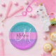 Lila, glänzende, lila, aqua und türkisfarbene Meerjungfrau Glitzern monogramm Name und erste Papierplatte. Individuelle Name und Monogramm sind in einem handgeschriebenen, eleganten Skript mit rosa Hintergrund geschrieben.
