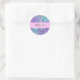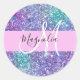 Glam lila, blau und grün Glitzer Glitzern Monogramm Name und erste klassische Rundaufkleber. Individuelle Name und Monogramm sind in einem handgeschriebenen, eleganten Skript mit hellrosa Hintergrund geschrieben. Sie können die Textfarbe, den Schriftart und die Schriftgröße mit der Option Anpassen ändern.
