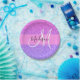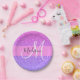 Lila, lila und rosafarbene Glitzer Glitzern Gradienten Monogramm Name und erste Papierplatte. Individuelle Name und Monogramm sind in einem handgeschriebenen, eleganten Skript mit rosa Hintergrund geschrieben.
