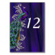Elegante Hochzeitskarte mit Tischnummer, mit einer lila Satin-Empfang, die einen Hintergrund hat, mit einem silbernen Ton, der die links der Karte hinunter blüht, mit einem farbenfrohen Pfau. Personalisieren Sie die weiße Zahl für jeden Tisch am Empfang. Matching-Produkte verfügbar.
