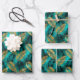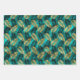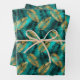 Papierfolien aus Glam mit goldfarbenen und schwarzen Blätter auf einem aquamarinen grünen Imitat-Hintergrund.