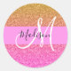 Glitzer-Glitzern mit mittlerem Farbverlauf monogramm und klassischer Rundaufkleber mit goldfarbenem Rosa und Orange, Gelb, Goldmedaille. Individuelle Name und Monogramm sind in einem handgeschriebenen, eleganten Skript mit rosa Hintergrund geschrieben. Ein perfektes Geburtstag- oder Weihnachtsgeschenk!