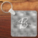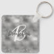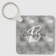 This elegant personalized keychain features a monogram and first name in modern charcoal gray and white script on a glam silver faux glitter and foil background.