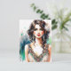 Celebrate timeless elegance with this exquisite Art Deco-inspired postcard, featuring a stunning brunette beauty dressed in a bejeweled 1920s flapper gown. Her emerald green eyes sparkle, complemented by dazzling drop earrings and a soft feather hairpiece. Painted in a modern watercolor and ink style, the background features abstract cityscape elements in jewel tones—blues, emerald greens, and golds—perfectly blending old-world glamour with artistic flair.