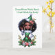 Glamourös afrikanisches amerikanisches Weihnachtself mit glitzerndem grünen Kostüm mit floralen und goldenen Akzenten, umgeben von Poinsettien und heiligen Blätter.