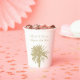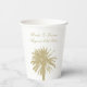 Glamouröses Party für Hochzeiten am Strand liefert maßgeschneiderte Papier-Cups. Exotische Designvorlage mit tropischer Silhouette von Palmen. Personalisieren Sie mit den Namen der Braut und Bräutigam plus Datum der Ehe. Teil eines schönen, passenden Themas mit königlicher Tischdekoration und formaler Schreibwaren. Beige Sandfarbe HEX Code #C2B280. Für kalte und warme Getränke können Sie Tassen aufstellen.