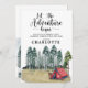 Lass das Abenteuer beginnt thematisch Aquarellprägung Camping Geburtstagseinladung mit Wald- und Gebirgslandschaft und Kalligraphie Schrift Typografie. Für ein Wochenende voller Spaß!