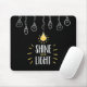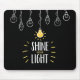 Weiße von Hand gezeichnete Glühlampeillustration, die unten mit einer glänzenden Glühlampe hängt (an) im Gelb in der Mitte des Entwurfs. Schreiben Sie Staaten, glänzen Sie Ihr Licht" mit hellen Strahlen auf beiden Seiten. Schrifts-Hinweis ist Matthew-5:16.