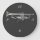 Eine silberne Trompete, auf Holzkohlenhintergrund.