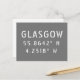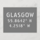 Glasgow Scotland Längen- und Breitengradkoordinaten in weißem urbanem Schriftart auf grauem Hintergrund (Schriftart- und Hintergrundfarben können leicht verändert werden, wenn sie gewollt werden)