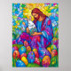 Die verkleidete Glaskunst Jesu Christi mit niedlichen Ostereiern, sonnig und lebendig. Niedliche Kaninchen zur Wiederauferstehung der christlichen Religion. Frohe Ostern mit Jesus und diesem niedlichen weißen Kaninchen.