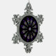 Ein hübsches Buntglasmuster schmückt diesen Zinnschneeflockenschmuck in dominanten Farbtönen lila, blau, gelb und schwarz. Zwölf abstrakte Federn umkreisen eine zentrale Maske, um ein spirituelles Mandala-Design mit einer indischen Empfindlichkeit zu bilden. Wunderschön für den Urlaub oder zu jeder Jahreszeit.