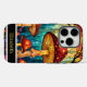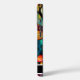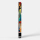 Dieses Handy bietet eine lebendige Buntglasdarstellung verschiedener roter und orangefarbener Pilze mit gepunkteten Kappen und strukturierten Stielen, Set vor einem Hintergrund abstrakter blauer und grüner Waldelemente. Die reichen, schmuckfarbenen Farben und segmentierten Muster imitieren echtes Buntglas und schaffen ein skurriles und künstlerisches Design. Unten ist ein schwarzes Band personalisiert mit "Elizabeth".