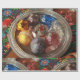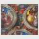 Glass ornaments are in a silver bowl. adjacent is a folk art placemat