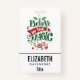Abzeichen mit personalisiertem Namen mit einer coolen Abbildung. Im Text steht: Glauben Sie an die Magie in extravaganter Schrift. Mit Weihnachtsbällen dekoriert.