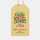Geschenke Tags mit einer niedlichen Abbildung. Im Text steht: Glauben Sie an die Magie in extravaganter Schrift. Mit Weihnachtsbällen dekoriert.