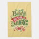 Ein Küchentuch mit einer coolen Abbildung. Im Text steht: Glauben Sie an die Magie in extravaganter Schrift. Mit Weihnachtsbällen dekoriert.