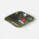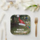 Feierliche Glaube Typografie geschrieben über die Weihnachtsmannmütze. Frohe weiße Weihnachtsschablonentext. Altmodische Ferienbaumleuchten in Rot, Weiß, Blau, Grün im Hintergrund in der Natur im Freien. Original Fotografie © TamiraZDesign.