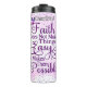 Dieses Bild zeigt ein aufregendes Zitat-Set vor einem lebendigen, blumengeschmückten Hintergrund violetter Blumen und verstreuten Punkten, mit zartem Rosa und lila Schmetterlingen, die herumflattern. Der Text "Der Glaube macht Dinge nicht einfach, macht sie möglich" wird in einem eleganten Schriftsatz dargestellt, in erster Linie in lila Tönen. Das Gesamtdesign vermittelt eine Botschaft der Hoffnung, Widerstandskraft und spirituellen Ermutigung.