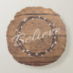 Glauben Sie die Textgestaltung für Weihnachten mit Kranz- und Schneedekoration auf rustikalem Holzboden