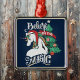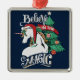 "Glaube an die Magie" erklärt das weiße Einhorn in diesem eleganten Holiday-Ornament. Das Einhorn trägt eine rote Weihnachtsmannmütze und hat ein rot-weiß gestreiftes Horn. Er steht vor einem verzierten Weihnachtsbaum. Alles ist auf einem marineblauen Hintergrund platziert.