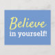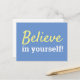 Motivierend, inspirierendes Zitat: "Glaube an dich!" Dies ist eine Postkarte, auf der Weisheitswörter zum täglichen Leben dargestellt sind. Das Design hat weiße und gelbe Schriftart auf hellblauem Hintergrund. Schriftart- und Hintergrundfarben lassen sich im Bereich des Zazzle-Designwerkzeugs leicht anpassen. Weitere Designs sind erhältlich.