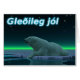 Ein friedlicher Moment in der langen arktischen Nacht. Ein Eisbär Erholungen am Rand eines offenen Bereichs im Packeis. Die Nordlichter leuchten in der Ferne; helle Sterne blinken über dem Kopf. Der isländische Text "Gleðileg jól" (Frohe Weihnachten) erscheint in blau-weiß. Eisbären sind gefährdet. Wie lange werden solche Szenen noch stattfinden können? Helfen Sie bitte, Polarbären vom Aussterben retten.
