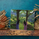 Zwei junge Damen blicken von hinter zwei Bäumen in eine üppige grüne Brille zwischen felsigen Hügeln, gefüllt mit kleinen Bauernhöfen, Hecken und Steinmauern und von einem glitzernden Bach bewässert, der die Hügel hinunter zieht.