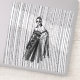 Das ist eine stilvolle Schwarzweiß-Modeabbilderin, die eine gepochte Frau in einem dramatischen, von der Schulter abgehenden Gewand mit aufwändigen Blumenverzierungen und einem fließenden, schieren Kap zeigt. Der Hintergrund weist eine auffallende vertikale Linienstruktur auf, die ein Gefühl von Tiefe und Bewegung vermittelt