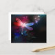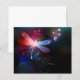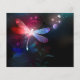 Glassierende, fliegende, rote Libelle mit durchsichtigen, detaillierten Flügeln auf dunklem, nächtlichem, leuchtendem Hintergrund mit tropischen Pflanze und Glühwürmchen. Rote Libelle.