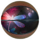 Glassierende, fliegende, rote Libelle mit durchsichtigen, detaillierten Flügeln auf dunklem, nächtlichem, leuchtendem Hintergrund mit tropischen Pflanze und Glühwürmchen. Rote Libelle.