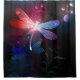 Glassierende, fliegende, rote Libelle mit durchsichtigen, detaillierten Flügeln auf dunklem, nächtlichem, leuchtendem Hintergrund mit tropischen Pflanze und Glühwürmchen. Rote Libelle.