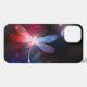 Glassierende, fliegende, rote Libelle mit durchsichtigen, detaillierten Flügeln auf dunklem, nächtlichem, leuchtendem Hintergrund mit tropischen Pflanze und Glühwürmchen. Rote Libelle.