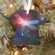 Glassierende, fliegende, rote Libelle mit durchsichtigen, detaillierten Flügeln auf dunklem, nächtlichem, leuchtendem Hintergrund mit tropischen Pflanze und Glühwürmchen. Rote Libelle.