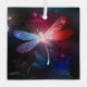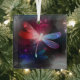 Glassierende, fliegende, rote Libelle mit durchsichtigen, detaillierten Flügeln auf dunklem, nächtlichem, leuchtendem Hintergrund mit tropischen Pflanze und Glühwürmchen. Rote Libelle.