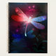 Glassierende, fliegende, rote Libelle mit durchsichtigen, detaillierten Flügeln auf dunklem, nächtlichem, leuchtendem Hintergrund mit tropischen Pflanze und Glühwürmchen. Rote Libelle.