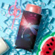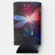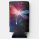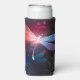Glassierende, fliegende, rote Libelle mit durchsichtigen, detaillierten Flügeln auf dunklem, nächtlichem, leuchtendem Hintergrund mit tropischen Pflanze und Glühwürmchen. Rote Libelle.