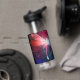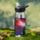 Glassierende, fliegende, rote Libelle mit durchsichtigen, detaillierten Flügeln auf dunklem, nächtlichem, leuchtendem Hintergrund mit tropischen Pflanze und Glühwürmchen. Rote Libelle.