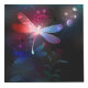 Glassierende, fliegende, rote Libelle mit durchsichtigen, detaillierten Flügeln auf dunklem, nächtlichem, leuchtendem Hintergrund mit tropischen Pflanze und Glühwürmchen. Rote Libelle.