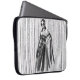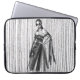Das ist eine stilvolle Schwarzweiß-Modeabbilderin, die eine gepochte Frau in einem dramatischen, von der Schulter abgehenden Gewand mit aufwändigen Blumenverzierungen und einem fließenden, schieren Kap zeigt. Der Hintergrund weist eine auffallende vertikale Linienstruktur auf, die ein Gefühl von Tiefe und Bewegung vermittelt