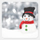 Niedlicher Schneemann glitzert in der Sonne. Roter Scarf, schwarzer Top Hut und grüne Knöpfe.