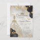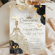 Goldglitter-Tiara, Kleid, Schmetterlinge und grüne Rosen auf grünem Hintergrund. Laden Sie Ihre Gäste ein, diesen Meilenstein mit einem Design zu feiern, das die Magie und Freude Ihrer Quinceañera widerspiegelt.