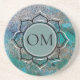 Auf einem abstrakten, blauen Gemälde mit festlichem funkelnd Glitzer für eine Kulisse ist eine elegante silberne Lotus Blume Rahmen, in der in der Mitte ist ein blauer Bereich, wo Sie es personalisieren können mit einem Logo, Namen, Buchstaben oder behalten wie mit den Buchstaben OM erstellt Zen wie Farben