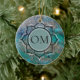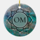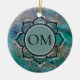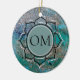 Auf einem abstrakten, blauen Gemälde mit festlichem funkelnd Glitzer für eine Kulisse ist ein eleganter silberner Lotus Blume Rahmen, wo in der Mitte ist ein blauer Bereich, wo Sie es personalisieren können mit einem Logo, Namen, Buchstaben oder behalten wie mit den Buchstaben OM erstellt Zen wie Farben.