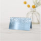 Sie können die schwarze Farbe der Zeilen und das Textetikett auf der Vorderseite dieser Platzkarten ändern. Ein schlichter, moderner Schriftart und eine elegante Kalligraphie werden verwendet, aber auch Farbe und Stil können individuell angepasst werden. Imitate hellblauer Glitzer und metallische Folie digitale Kunst, mit weißen Funkeln Grafik auf gefalteten Platzkarten für Ihre moderne Hochzeit.